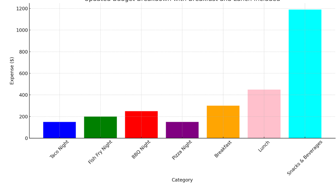 The budget covers all meals, beverages, and snacks, ensuring we have a variety of options available at all times for both adults and children.